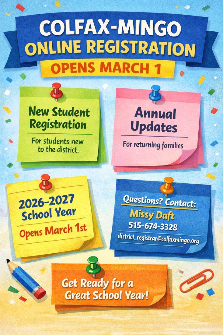 News Feb 27, 2026 District Colfax-Mingo Online Registration News Home More News Spring 2026: Colfax-Mingo Connection Continue reading January 2026 SOM Continue reading